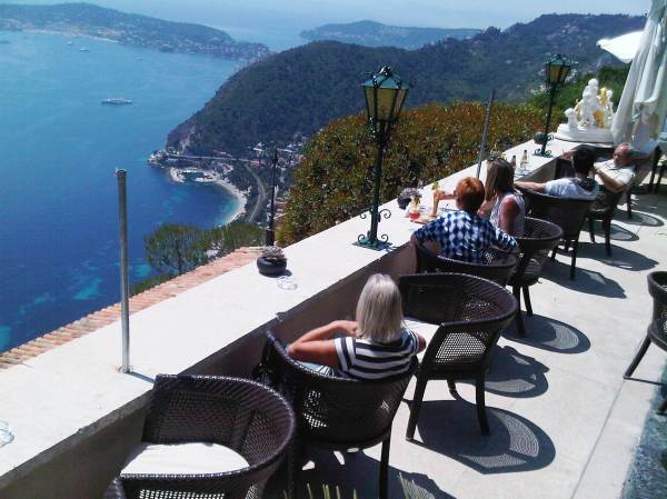 We take a stroll around the marche de fleurs, and then set off to explore the very beautiful Eze village, where U2 have their homes, and no wonder! After an exhausting climb to the top of the village we stop for a glass of beer and a coupe de champagne at Le Chevre D’Or which has the most fantastic views down to Cap Ferrat, Nice and beyond as my picture today shows and am