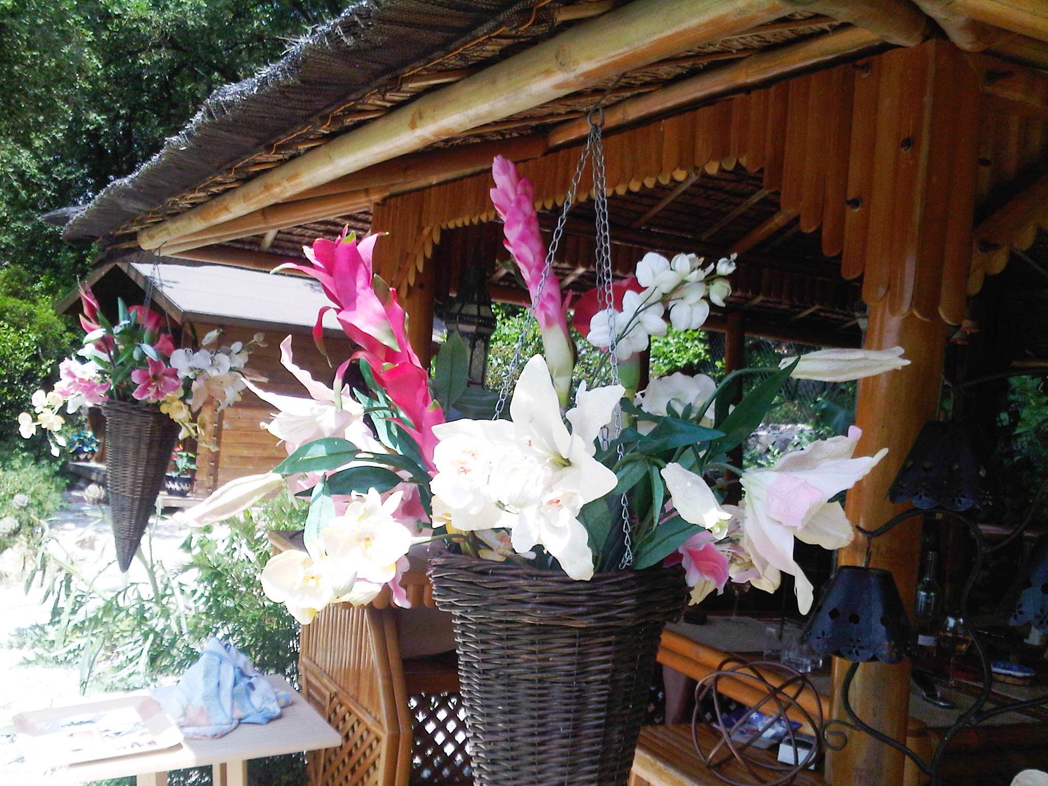 The last-minute decision not to go the beach yesterday was frankly very welcome, a couple of glasses of rose in the pav gave the almost perpetual hangover,which is omnipresent whenever the Savins are in residence, a brief respite, and was followed by that rarest of summer animals, an early night. Before retiring Pedro I partake of a rather good 2003 Bordeaux, the first red wine to pass my lips in some time. Earlier in the afternoon Janie Savin commented on how good the lilies looked at the front of the pav, which she had been assiduously watering each day as shown in my picture today. I am now seriously worried about mildew because they are, as everyone knows except the lovely Janie, that they are of course fake, however she is convinced that the fake banana palm which she has also been watering looks greener. I spy something that looks like budding banans today, who knows how much they might grow overnight