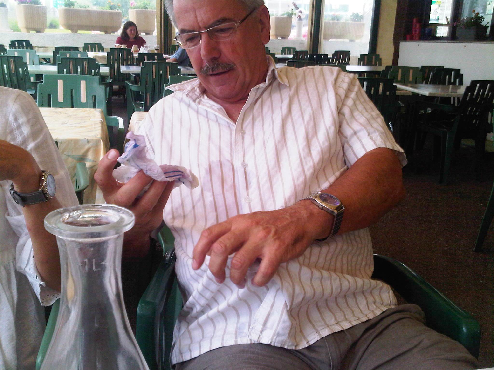 The last supper, well lunch, was the usual good solid meal one associates with the Auberge St Donat, 5 courses with frankly as much wine as you can drink, but all I can focus on is that, after a week of serious liver abuse, house guests the Savins are going home! Yet again someone has filled up my bottle recycling box – which has had to be emptied twice on some days recently – and I am beginning to think that in some way The Savins are involved. Once I have a day without alcohol, the mists may clear and I may understand how this happens, in the meantime I need closed circuit TV to spot the culprits. And talking of culprits, we are joined at lunch by wing commander Spensley, erstwhile tennis partner, a.k.a 118 senior, the older part of the mustachioed old gits as we are sometimes collectively known. He is in good form, and despite protesting that he “can’t have a big one as he has work to do” manages to pack away enough red wine to make a dent in the european wine lake, if such a thing still exists. Actually its a moot point, can one make a dent in a lake? And as if he was not content with drowning in wine, he later decided to wear some of it as 1 of my pictures today shows;