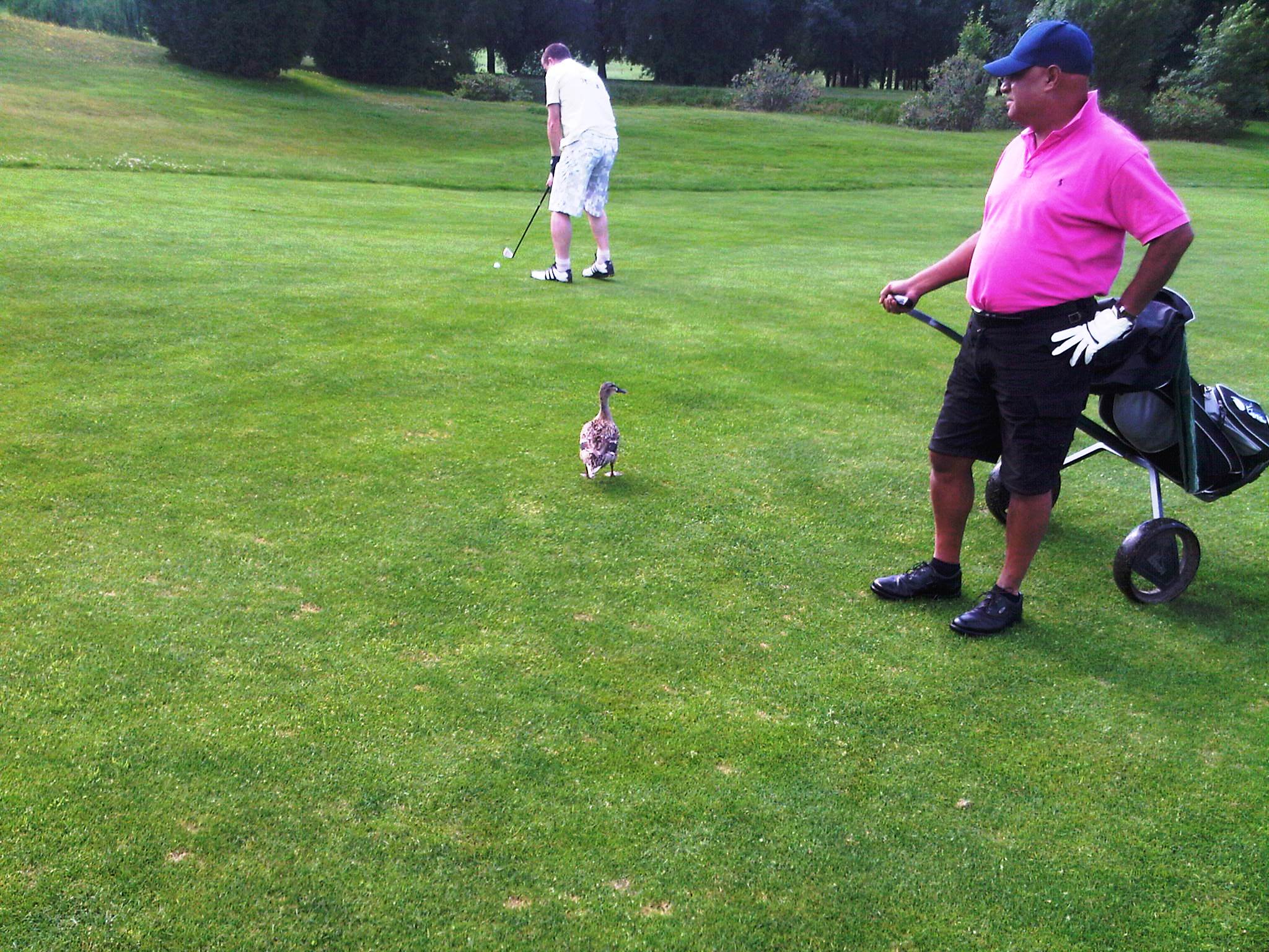 My picture today was taken at the Grande Bastide scene of my epic victory in difficult circumstances last Sunday. It shows my 2 protagonists on the day, Dave Goddard from his best side (ie his backside) and Dilip Soni manfully filling out (almost to capacity) that shirt, and a duck that happened to walk by.