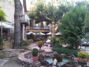 With the arguable exception of the meal at the North’s, in the urine stained, gale lashed zipped up gazebo, which was technically outside, Le Manoir at Mornas gives us the first opportunity to eat outside since we set foot in England.