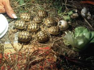 Tortoises hatched yesterday, note the little chap on the right, fighting his way out of the pastry parcel