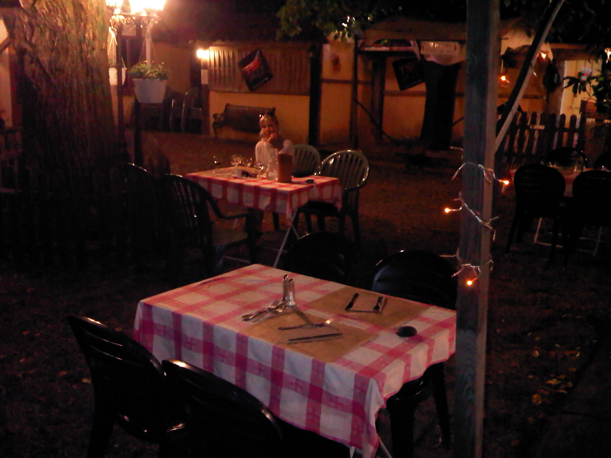 That nice lady decorator decimated a bottle of rose in under an hour but I was, as you would expect, far more abstemious, I think a bottle glass of red wine quite sufficient for one to appreciate ones surroundings and start to philosophise about life. The fact that no one was sitting within 10 metres of that nice lady decorator should not be misinterpreted , in fact by the time this picture was taken at about 2am, there was no one within 30 metres. I am rather too delicately inclined to reveal the reason, but if any of you suspect that her solitude was due in part to methane production, then they may be very near the mark. By this time, the staff had changed into their  jim jams (and gas masks?) giving a big hint that perhaps it was time to go home.