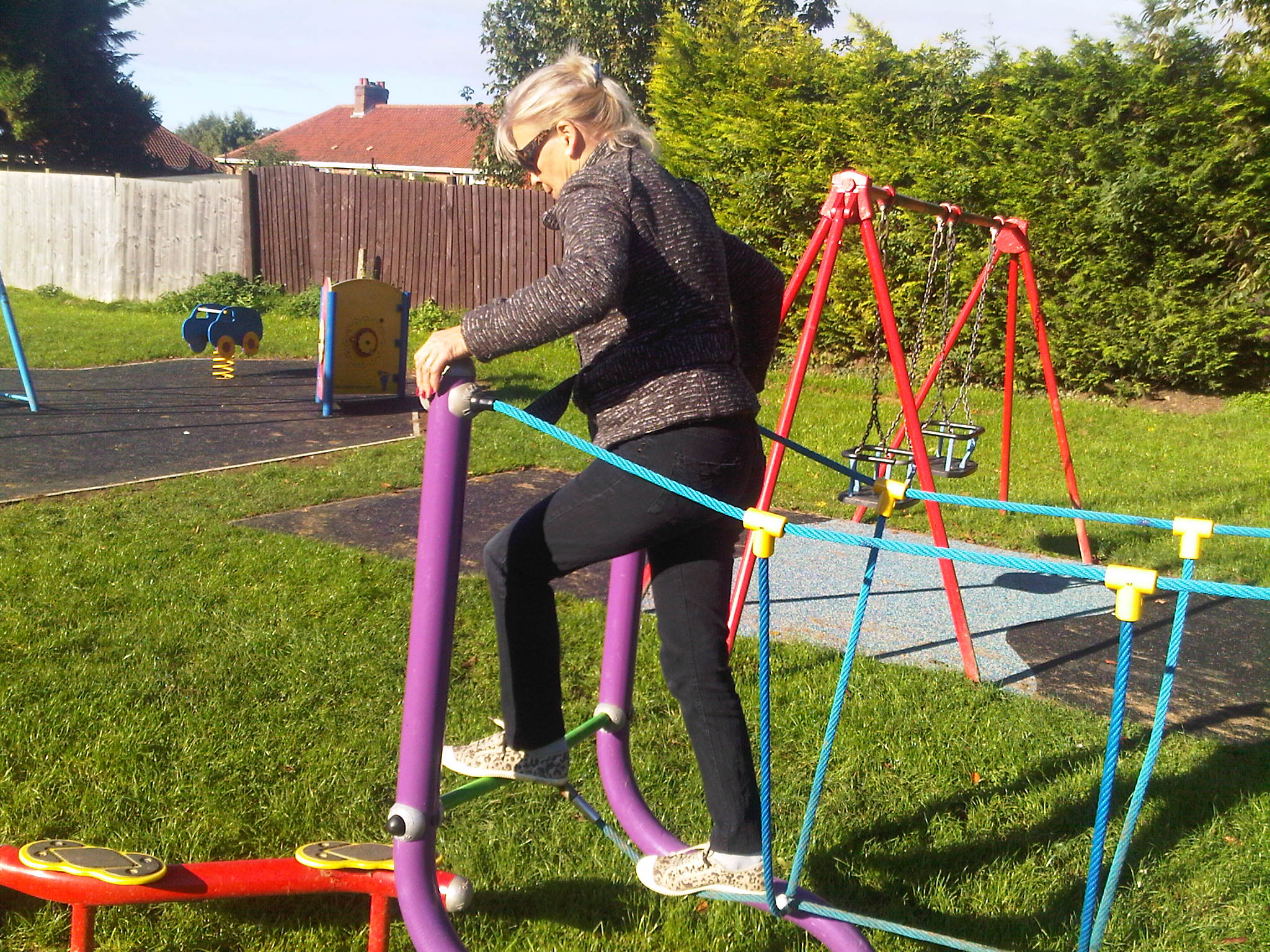 On Sunday, that Nice lady decorator removed her slippers which she had habitually worn for breakfast at the hotel, in order to go and play on the swings and children’s play area in Wymondham as my picture today shows. What the picture does not show is the warning that the equipment should not be used by anyone over the age of 5.