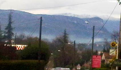 I have to report a rather depressing response to my suggestion recently that the malevolent idiot black and white mutant cocker spaniel, Banjo, should not have a bell attached to his collar when I walk each morning dodging the French hunters in the forests, so I have come up with a plan. If I get him some woollen mittens to go on his paws then he wont be heard at all by the hunters and may survive the cull walk.  Although with the weather today, Walking is off the agenda, and the first snows of winter are at nearby Greoliere, as you may be able to see from this fairly indistinct picture taken from the edge of Valbonne yesterday afternoon.