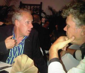A lovely dinner at the evil-smelling Hotel Des Ambassadeurs in Juan Les Pins courtesy of HSBC Antibes might have been a welcome respite from non stop work, had I not been working on behalf of Currencies Direct. Networking is best done on social gatherings, so regular readers will know just how hard-working I am. Local characters such as the mythical financial advisor Rod Mitchell were enjoying the hospitality. Mythical because no one is completely certain he exists, and most of his clients are certain he does not know how to dial out, such is his reputation, cheerfully accepted, of not returning calls. Media types rubbed shoulders with bankers and I caught Wayne Brown from FR2day in typical flow with Ab, president of the Riviera Business Club in my picture today.