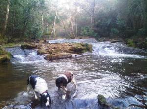 The river Brague near Valbonne. Banjo, the cocked up cocker is on the left, the proper dog, English springer, Max, on the right