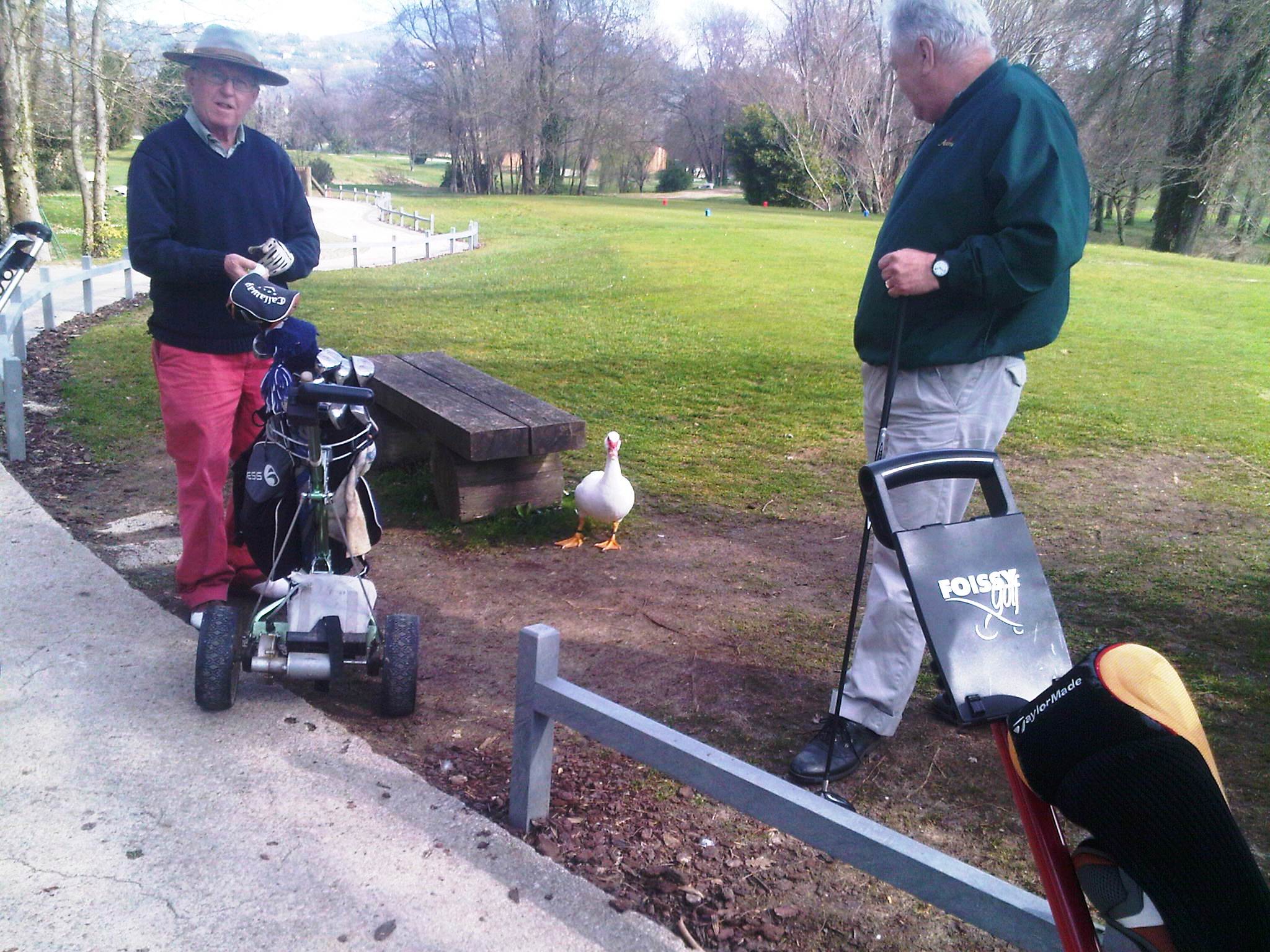 Golfing partners Bob Jones on the right and Nick Kail on the left. Mile Lorimer the last of our quartet is here being impersonated by a duck.