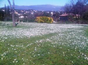Any suggestion that the weather in the Cote d’Azur was appalling or that it rains incessantly is clearly a huge misunderstanding. Nothing could be further from the truth, it was 21 degrees yesterday with clear blue skies and the top was down on the Merc for the first time this year, but this type of weather creates a different problem. The lawn will need mowing. I need to murder some daisies as my picture below shows. Unfortunately, the doubtful dog, Banjo, hates the lawnmower more than he does pizza delivery bikes and wheelbarrows. This will be less of a problem when I have a sit on mower, which I am promised soon, as I am having it specially adapted “road kill” option fitted, in order to be able to run over miscreant animals. I wonder who will be first?