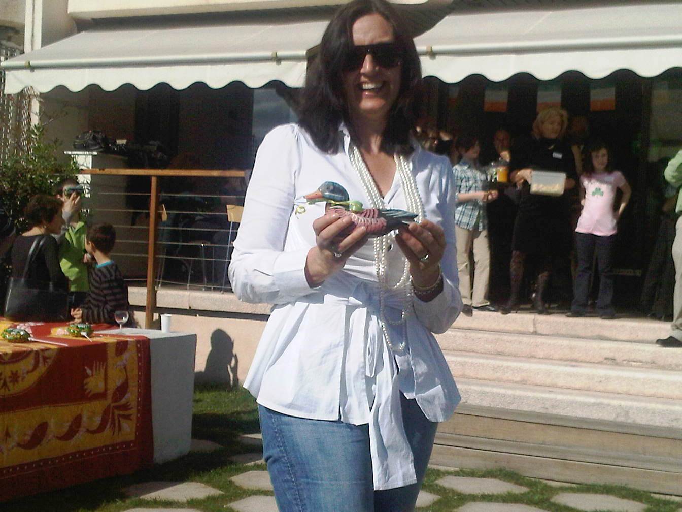 Further, to join in this touching and joyous celebration, we went to a belated St Patrick’s Day celebration organised by the International Club of the Riviera at the Scandinavian Terrace on the Croisette in Cannes yesterday. Amongst those attending were the lovely Jude O Sullivan who entered the raffle solely because there was a 2 litre bottle of Bailey as one of the prizes. Sadly, all she won was a duck, as my picture below shows.
