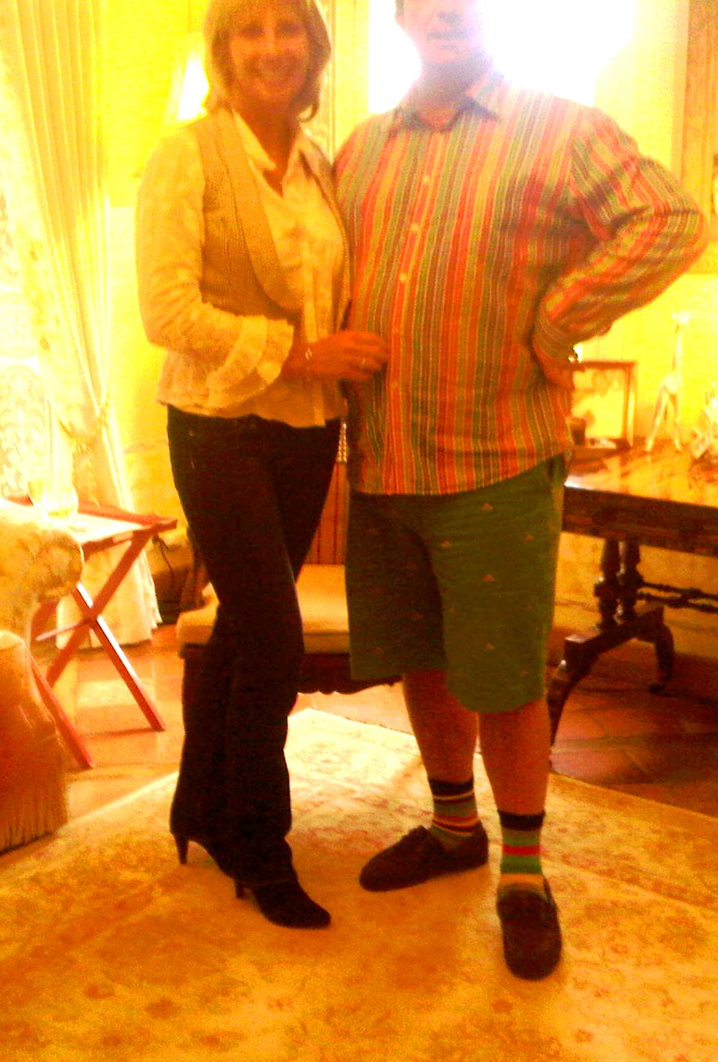 This time it was green Ralph Lauren shorts, striped green and yellow shirt and mismatched hooped socks, an outfit which even he suspected looked a little gay. He asked a dear gay friend if there was any danger that he could be mistaken as a non-heterosexual but was quickly reassured that no gay person could ever have such poor taste as to wear anything that Peachy might wear. I have attempted rather unsuccessfully to catch the full horror of it below.
