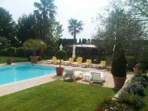 A splendid barbecue yesterday afternoon  with Roly and Leslie, at their sumptuous villa near Valbonne.  So sumptuous was it,  that after spending nearly 6 million Euros buying it, they have decided to knock it down and build something else! They are wonderful hosts, only falling down at the hurdle of whom to invite. Much as I like Jude and Johnny O Sullivan, that’s the end of the sentence. I could not think of a way to finish it off. I took a picture of one of the beautiful outside eating areas behind the pool, which looked fab to me, before they knock it down;