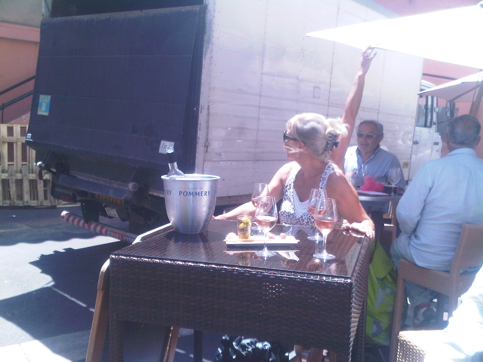 My picture today was taken last weekend when we were in Cannes courtesy of old pal Wayne Brown from FR2dayand shows that nice lady decorator giving her customary laser beam look to a lorry driver who had edged within one inch of our table when taking a right turn. The UK Health and Safety nappy brigade would have had a field day with this one, dozens of happy revellers in the Cafe du la Marche having to move slightly to accommodate the lorry, with not a gendarme in sight and clearly all crash barriers are banned in Cannes. But no-one was hurt, the lorry driver who was in the deepest danger was able somehow to avoid the laser beams emanating from that nice lady decorator (although I thought I detected a searing of the paint work) and more important, not a drop of rose was spilled.