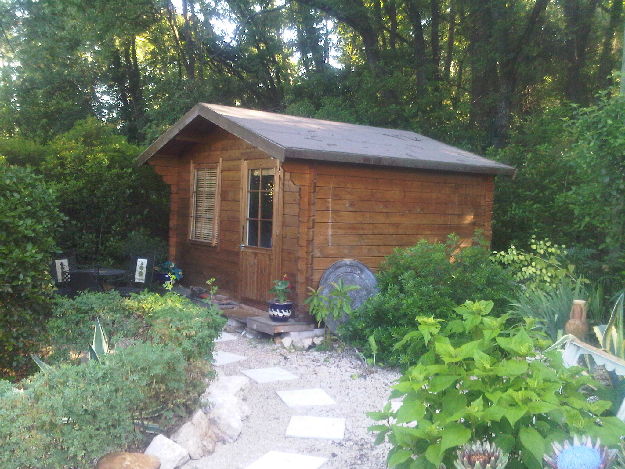 Thereafter the hard-core adjourned to the web for a nightcap, before we bedded down in our log cabin chalet pictured above. This summer retreat, as I like to call it, is another creation by that nice lady decorator, although she did buy it in kit form and it took her 7 days to build last year. I wonder if Noah had a kit for his ark? It is fully equipped bedroom, but without the benefits of water or toilet facilities. I like to think of it as a summer love palace. She does not.