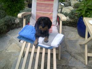Crash helmets for dogs? It’s not something that I have come across before but my dear new friend Tracy, still a friend despite my honest assessment of her homeland, the north of England, as a tundra strewn backward wasteland, decided to bring her little dog over to visit yesterday. The dog in question is tiny, a dachshund or shitehound as I like to call it, and does not have enough meat on her even to fill a decent sandwich. She (the dog) often travels on their motorbike owned and ridden by her partner,the impossibly good-looking Pascale the pilot, whom I had earlier allowed to defeat me on the tie break on the tennis court at the Vignale in Plascassier. You may consider that I should expect to lose to a man sixteen years my junior, who had been coached by his tennis coach father, but I had a match point which he won with a fluke. Angry?, me? of course.