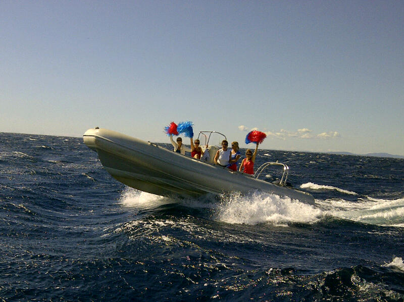 The WAGS had taken charge of a rib, which is fairly apt for women, having a spare rib, and had spirited a magnum of champagne and several bottles of wine aboard, together with their red white and blue outfits resplendent with red and blue pom poms, as my second picture of the day shows below.