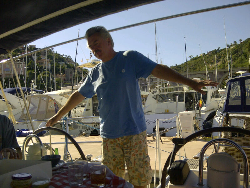 My picture today is of the wingco taken on l’Exocet during the famous victory in the Bistro Rally earlier this week. As you can see, the wingco is getting into the swing of things, I think he was singing “we are sailing, we are sailing” although at that stage it is true to say that we had not yet left the port.
