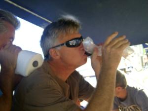 Amongst those celebrating to the fullest extent was the owner of a well-known villa rental and management enterprise, whom I cannot identify here. Clearly thirsts were running high, so high it seems that the wine, stored in bladders from wine boxes (it being deemed too dangerous to allow bottles on board) was in danger of running out. In an entirely unrelated picture, I managed to capture a photograph of Greg Harris from Cote d’Azur Villa Rentals finding an interesting way of removing the last vestiges of wine from one of these bladders.