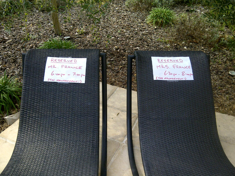 It seems that the nice lady decorator and I have a reputation for a short siesta, often during long drawn out lunches. I was not aware of that reputation until I came across these signs strategically placed signs on two sun loungers close to the pool yesterday as my picture today illustrates. It therefore seemed the right thing not to disavow our hosts of this erroneous impression they had mysteriously gained and we dutifully peeled off for a short sojourn at the appointed time.