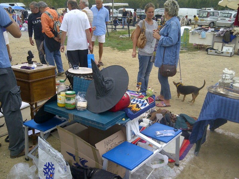 As it happens I have a picture today of the car boot sale taken in Valbonne last Sunday. There was an interesting hat on this stand, I wonder if that nice lady decorator was tempted?