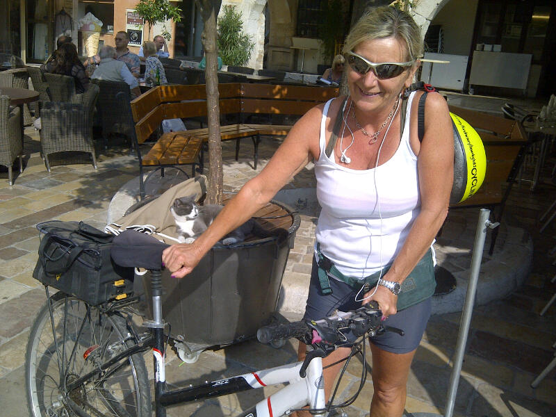 Much help was secured today from one Bev, friend of Viv Frost pictured today, a retired FIFA event manager, used to staging shows for royalty and top international government officials. Clearly this event of such a stature that a woman of her experience was required to iron out the minor technicalities. Her intensive and prolonged browbeating of the poor chap in charge of the Auberge Provencal in Valbonne Square reduced him to a quivering jelly by the time she had finished with him, and she was the single most important factor in confirming all the details today. Her coup de grace was suggesting that the Mayor should be invited. Suddenly doors that were closed swung open. She is a very interesting lady, and at first I was intrigued why she would want to meet me (flattering enough in itself) but why she was wearing a cycle helmet and sports attire. It transpires that she is in training for a cycle around Cuba shortly to raise funds for Murray’s Muscles. You will have to click on this link to find out more! . I remember when I was young that there were several of my contemporaries of the female persuasion who were likened to bikes and for a few seconds the memories of those good old days came flooding back, but I was jolted back to reality as she ran over my foot with her racer. I did manage to get this picture though before she rode off into the mid day sun.