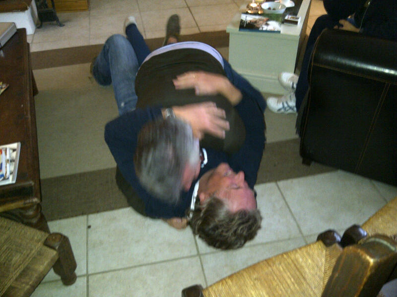 Sunday evening at a quiet dinner with Master Mariner Mundell and the lovely Zillah, “the sailing one” discovered on my phone a number of photos taken after the rugby, when things got a bit out of hand at my house. He was particularly keen on this one and I must admit it is rather intimate and touching? Although who is doing more of the touching is something I do not want to delve into as you will see from the picture below. The Master mariner has a touch of the pirate about him, claiming that he was going to sail into Cannes this week to lunch despite the G20 summit meaning the whole town is just about locked down. He has  a scheme in mind that I cannot reveal but from what I recollect it involves flares, fertiliser orders, men overboard and a three-pronged RIB attack on Cannes harbour. However, I am reasonably certain he awoke this morning and imagines it was all a dream. I certainly hope so, but I will go and visit him in prison if he goes through with it.