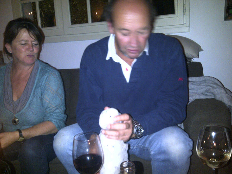 Last night to a celebration of nearly a very significant birthday for Master Mariner Mundell, starting off from his Valbonne apartment and then ending up at The Kashmir Indian restaurant in the village. This gives me an opportunity to use a photo from last weekend after Sunday’s luncheon, when the Master decided to liberate from my freezer the snowman he fostered after the Rugby World Cup Final and make some running repairs to his err…form. What I like about this picture is the expression of the god-like Zillah, his wife, as he “works” the raw material.