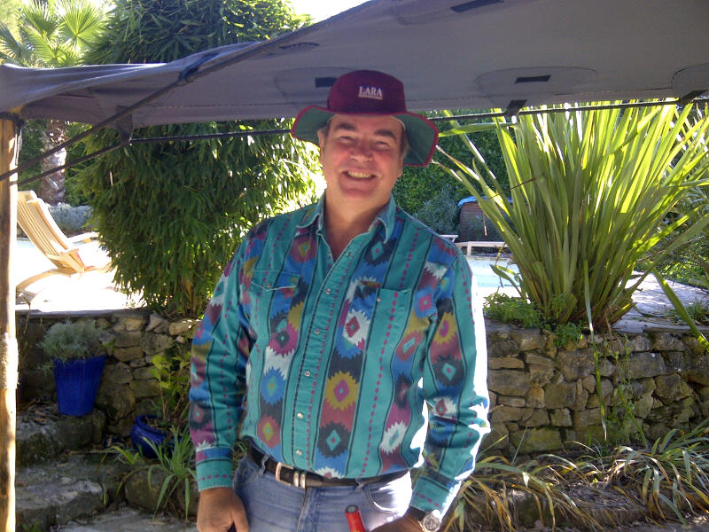 No such claim to darkness can possibly be leveled at the subject of today’s photo, well certainly not to the photo itself anyway. Of course there is always likely to be some darkness wherever the shadow of this man mountain is cast. It is of course Matt Frost, brother of Stephen, Valbonne’s very own mortgage broker and owner of French Mortgage Xpress in the village. There seems to be some kind of sartorial cry for help going on here. I like the shirt and I like the hat, but combining them? I have no pretensions to good taste, in fact I have heard it stated that I have absolutely no taste, however, even I would not be as daring as to attempt to combine a brightly coloured Brazilian shirt with a cricket hat when invited out. It is a pity we cannot see what are on his feet, flippers perhaps?. The picture was taken at a recent luncheon at my house before the customary degeneration in standards of behaviour, and clearly before my style guru Mr Humphrey’s had expressed an opinion.