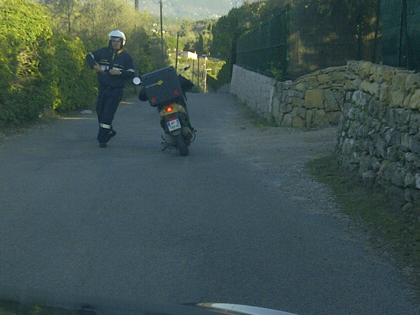 My favourite cross word clue relates to the forthcoming festive period; postman’s problem at Christmas? How many letters? Answer; bloody millions. Given that backdrop it is perhaps not hard to sympathise with the postmen when they are on their rounds at this time of year. So with that in mind, I would not like to criticise our own postman for abandoning his motorbike in the middle of the road into Valbonne, which is the subject of my photo today.