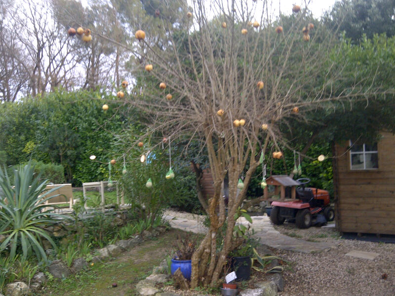 I admit that whilst amusing me it did ruffle my feathers a little, Ok that’s enough bird jokes, I don’t wan to get into trouble or I may end up in front of the beak.I have a picture today of the pomegranate tree festooned with the various balls of bits of bird food languishing in between the old fruits but not a bird to be seen.