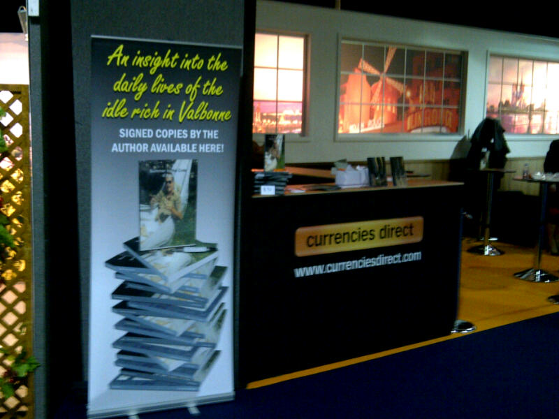 My picture today shows the pull up for my book designed by the redoubtable Valbonne resident Paul Thornton Allan of The Big Picture throwing the very expensive Currencies Direct stand into the shade. If only they had spent £150 like me instead of £80,000 they could have had a pull-up like mine.