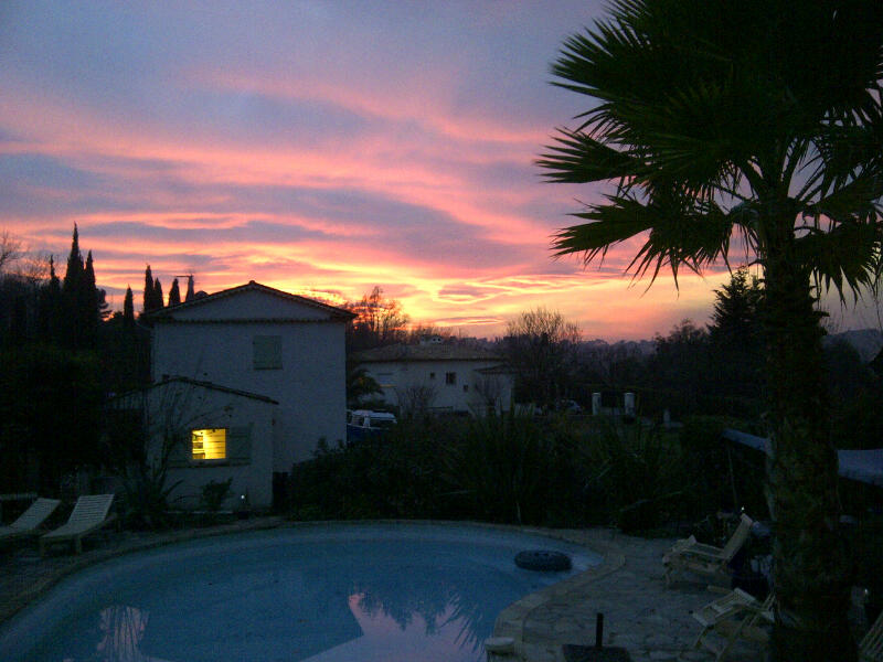 A mild day yesterday ended in a spectacular sunset and it was mild enough to sit in the newly repaired pav in early evening for a calming glass of wine, from where I took this picture. A great sunset like this implies a few clouds in the area, so perhaps some hope for the local ski resorts?