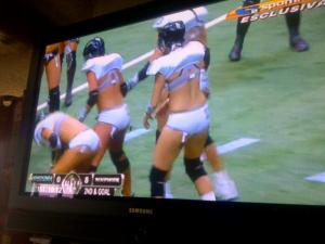 Let me explain; we were finishing lunch when my attention was drawn to the TV screen which was showing a programme which turned out to be the lingerie Superbowl in America. I jest not. A number of scantily clad ladies were playing American Football and I managed to take several pictures of the action of which this is the only one I can reproduce.