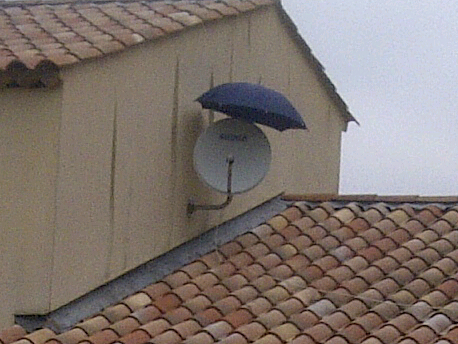 Earlier during my normal morning constitutional around the Valmasque (where I saw sights that would make Slash and Burn salivate given the number of trees and branches felled the recent snow) on the edge of the forest I spotted a house with a satellite dish protected by an umbrella as my picture shows.