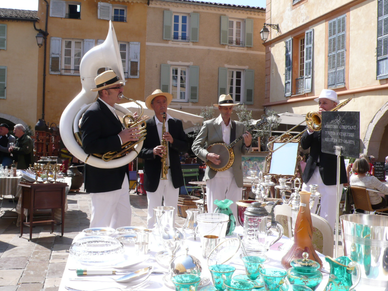 With my meeting yesterday postponed I had a day without an alcoholic beverage. Government advice warns against binge drinking and suggests some time off each week, so now that is over I am looking forward to good lunch today with and courtesy of the lovely Pippa and Cosette, fellow Currencies Direct warriors both, with a plan to go to Cafe Des Arcades in Valbonne Square, although unwelcome clouds appeared yesterday morning. This is the kind of weather I shall have to get used to all over again during this year now that I have been forced to spend more time in England with my money due to Mr Sarkozy’s callous changing of the tax laws. In the meantime here is a picture taken by Paul Slash and Burn Thornton Allan yesterday in the square with a charming Dixie land jazz trio setting the mood. well it was an Antiques Fair and none of these guys look like spring chickens.