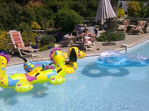 My picture today is taken of my swimming pool, adorned as you can see with a range of very tasteful of inflatables. That nice lady decorator can be seen in the background taking a few moments from her busy schedule to ensure that the inflatables were all pointing in the same direction. These were her idea, a tasteful (in her words) adornment for the swimming pool, a range of cheap plastic blow up cartoon characters. A cruel observer may conclude that she had an inflated view of well, you know, an inflated view.