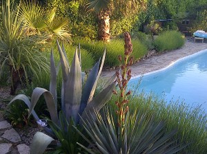 So to break ourselves in gently we elected last night to partake of a couple of beers whilst watching the sun go down in the pav from where I took this picture. The Yucca is about to flower, that or we have a red hot poker tree.
