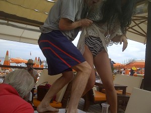 This morning there will be more tennis doubles. The MOGS are scheduled to take on Mr Clipbeard and another chap whom I cannot name (although Nick Davies, a regular tennis player may well have his phone turned off between 11am and 1pm today) as I have taken the trouble to crop his face out of my picture today. I did not think he would benefit from being identified for obvious reasons. It was taken at Tahiti Beach in St Tropez last weekend where I think it shows a rather elderly gentleman dancing with his “neice”.