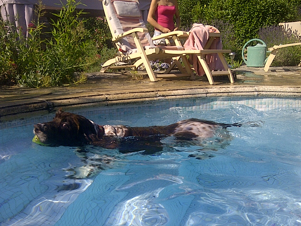 It is now hot here, so hot that even I, a confirmed non swimmer, have had to seek solace in our swimming pool for extended periods in order to cool down so that I am able to concentrate on the best ways of securing new customers for Currencies Direct. What is sometimes a little disconcerting whilst so engaged is to hear a loud splash and then find a spaniel swimming by with a tennis ball in his mouth as my picture today shows.