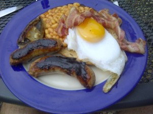 We set off yesterday morning in mild temperatures but under glowering skies to walk the dogs at Rustington, with the hangover nurtured nicely, and by the time we reached the sea it was blowing a hooley and lashing with rain. “Whats wrong with you?” said that nice lady decorator as, after 30 seconds in the freezing wind tunnel of rain-lashed horror, I was back in the car. I was wearing shorts and a t-shirt, she was wearing oil skins and a caribou hide jacket. Fine for her, not for me. A good hearty English breakfast was required to restore order as my picture today shows.