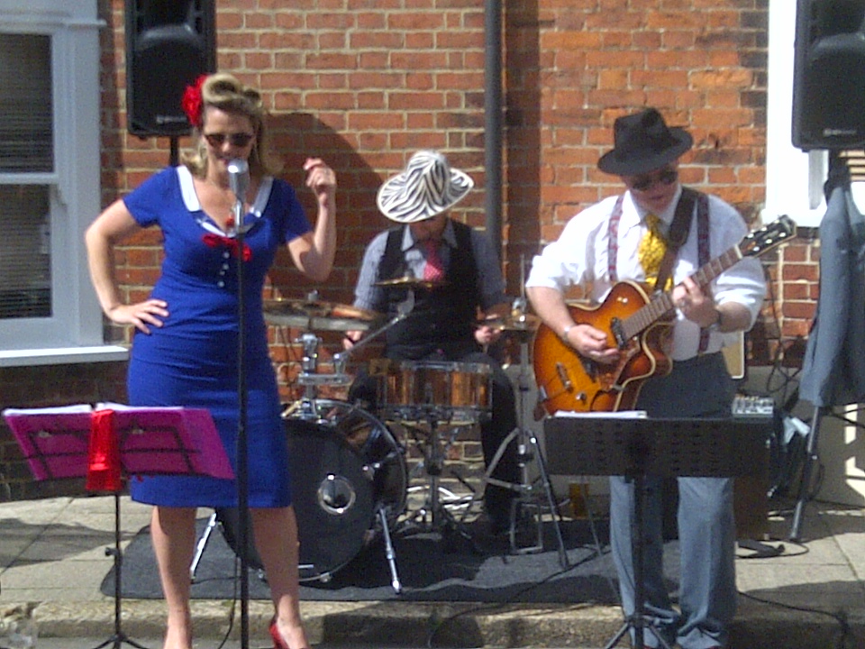 Beside where they were playing there was a stall specialising in vintage attire, so that nice lady decorator was in retail heaven and found an original electric blue Biba jacket. The drummer was changing hats from that stall between songs and I especially liked the one he is wearing in the picture.