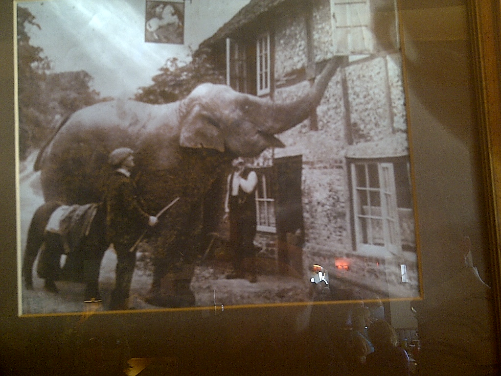 On the mantelpiece of this wonderful old hostelry, which had the original machinery for a roasting spit still in place over the log fire, I came across this picture. It seems that in 1906 a travelling circus came to the area and the elephants were taken to the river at nearby Amberley to drink, the circus owners being unaware that being tidal the water was salty, so they went in search of fresh water and, although I am not sure how it came about, one Indian elephant found a bucket of it in an upstairs room. I took a picture of that picture.