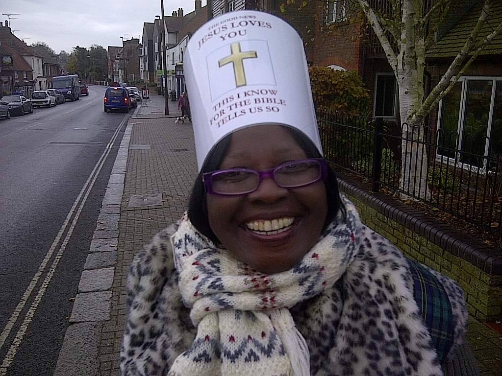 That Nice Lady Decorator wanted stuffing (for some upholstery she is doing) and had sourced a shop in the town where she could get wadding. It was that interesting. Rather ironically I had earlier been uplifted somewhat to spot this particular young lady whilst on a quick dash down to the post office in the rain. She was trying, and succeeding, to raise people’s spirits, although I suspect not in quite the way she did for me. I particularly liked the cone-shaped hat bearing the slogan “Jesus Loves You”. The Reverend Jeff would have been proud of her zeal, perhaps she even works for him? Anyway, she did her job, I laughed at the absurdity of her ridiculous optimism in the face of a disgusting drizzly day, and being faced by a religious cynic like me. I told her I would worship the Lord if he parted the clouds and made the sun shine there and then, but sunshine came there none. She agreed to allow me to take a photo of her only if I took one of her printed psalms, which I did, as we are short of paper with which to light the fire. I suppose a man desperately clutching at the straws of humour might say that she psalmed it off on me, but luckily for you, dear reader, that person is not me.