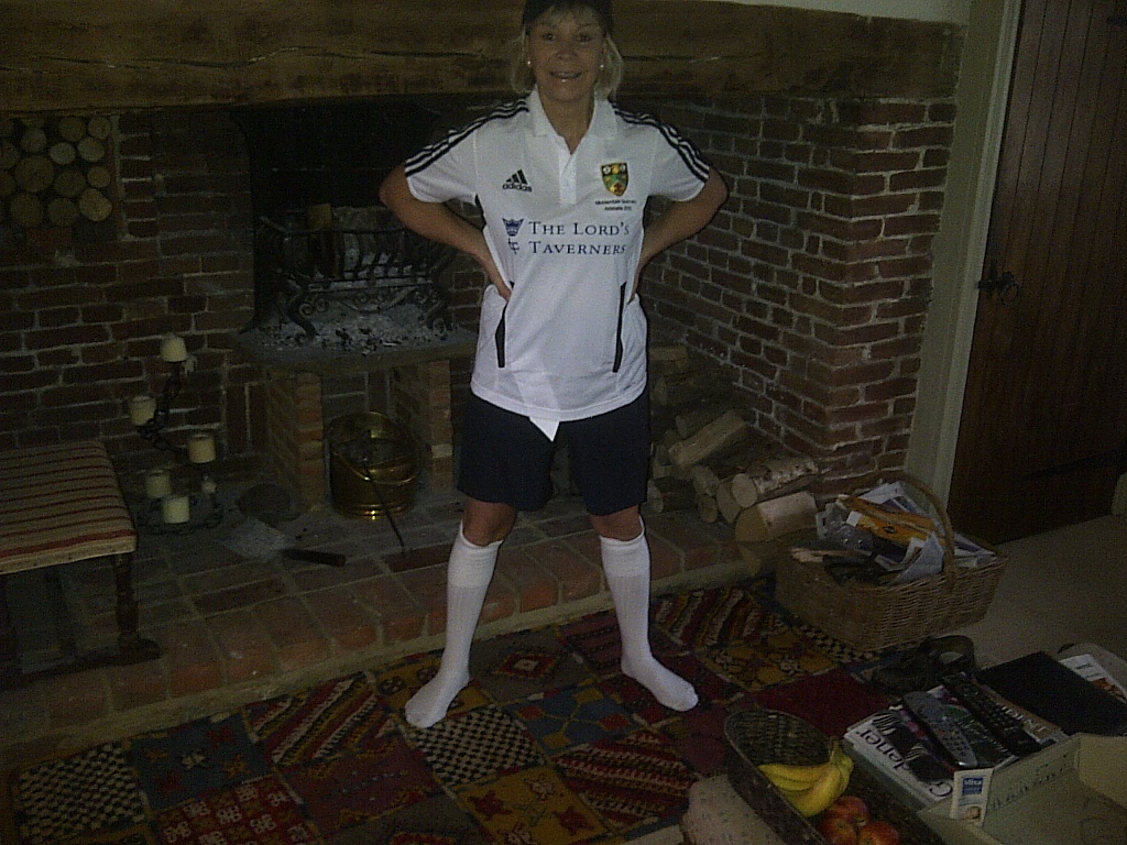 If you want a measure of how the afternoon unfolded, or more accurately collapsed into a heap, I do recall sitting in the pub garden after dark, smoking a cigar and talking cricket with Steve the Wheelchair. Our Australian trip, when I shall once again pick up a cricket bat for the first time in years in readiness for the Golden Oldies Cricket tournament in Adelaide, starting in little over a weeks time, is looming into view and high in my thoughts. The picture above is of that Nice Lady Decorator modelling the team kit which I shall be required to wear at the opening parade of nations. Please note the ridiculous long white socks.