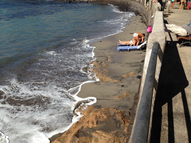 My picture today is of the tiny bay in this little Canarian village which was considerably bigger when we arrived because the tide was out. These guys are obviously determined to make the most of a sunbathe on the beach, or more likely are about to get a rather wet awakening. Had we more cash for another beer we would have waited for the inevitable.