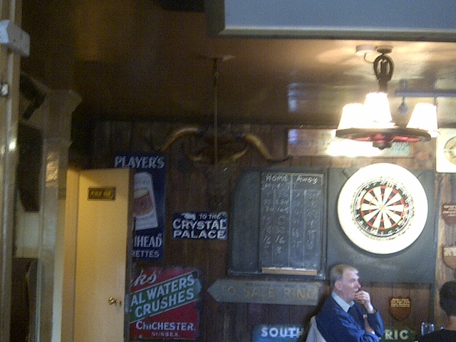 One is never enough so on the way back we dropped in to the historic Murrell Arms at Barnham. The pub features a game that I have never seen before which involves swinging a ring on a long piece if string attached to the ceiling like a pendulum as my picture today nearly fails to capture. The object of the game is to swing this ring and get it to settle in the bulls nose, fixed on the wall of the pub at about head height. We stayed just for the one . Although it has the best beer in the world on sale, Fullers London Pride, the pub was rather drafty and uninteresting so it was back to Arundel to keep an eye on the 6 nations rugby.