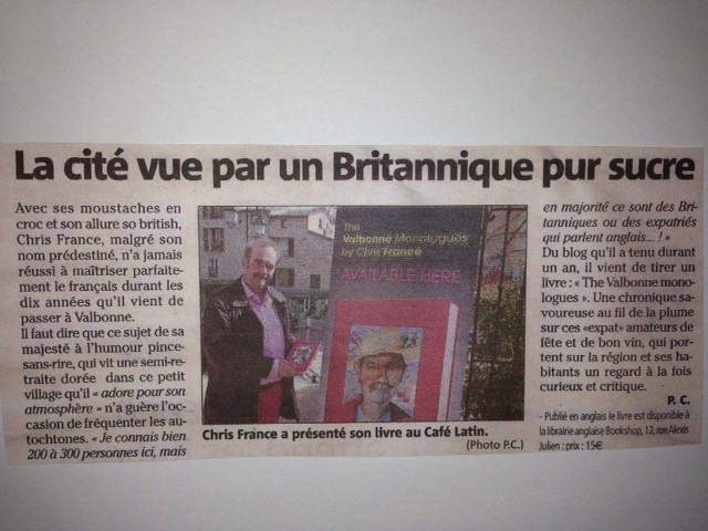 Thanks to the good offices of Roly Bufton, who employed some of the vast resources available to him, I now have a copy of the Nice Matin, the daily paper of Nice in the Cote d’Azur, and the article about my good self and The Valbonne Monologues. If they are correct then I did not understand many of the questions, but I would contend that they did not understand my answers. I thought it only fair to share it with you, my adoring readers, today.