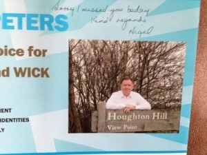 Perhaps if the local conservative council candidate, who kindly placed a pamphlet through my letterbox today, could learn something if he read this column every day. For instance he may have learned of the reputation, or what kind of a view one might expect to err… come across there. So when I saw the picture of him on the front of the brochure leaning on the sign at Houghton View, it made me laugh out loud. If he were to read this column carefully, he could also learn about the benefit of having an account with Currencies Direct. Here is a picture of that brochure.