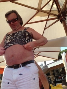 It got worse a little later when, after a very large “sex on the beach”group coctail with a dozen straws had been heartily consumed by the party, for some reason unknown to science, Peachy Butterfield decided that he should swap tops with the birthday Decorator. It is my picture today, so please look away now if you’re squeamish or about to eat.
