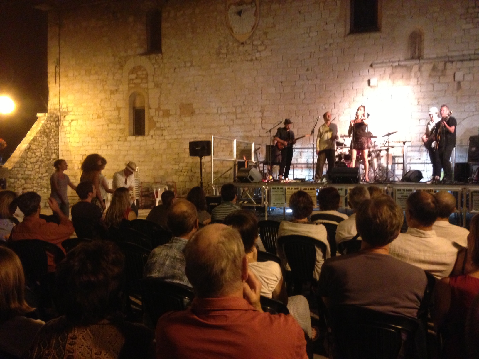 I once had my picture taken with REM. I said to That Nice Lady Decorator “that’s me in the corner”. Last night then to Tourette’s Sur Loup to meet old pal and drummer Jaren Lamb showcasing his new group in a splendid setting in the centre of this beautiful village. I have a picture of the event as today’s photo. Enjoying a dinner in the pretty old square, a carafe of wine and then being able to see the music from ones seat is my kind of rock and roll these days. The band were great and the girl singer exceptionally good, both vocally and performance wise. There seemed to have been a name change on the night, now being called Apetown, by an entirely undemocratic process where the first singer announced she did not like the name they had chosen (which was so complicated I have forgotten it), and announced the name when on stage, much to the chagrin of the other band members.
